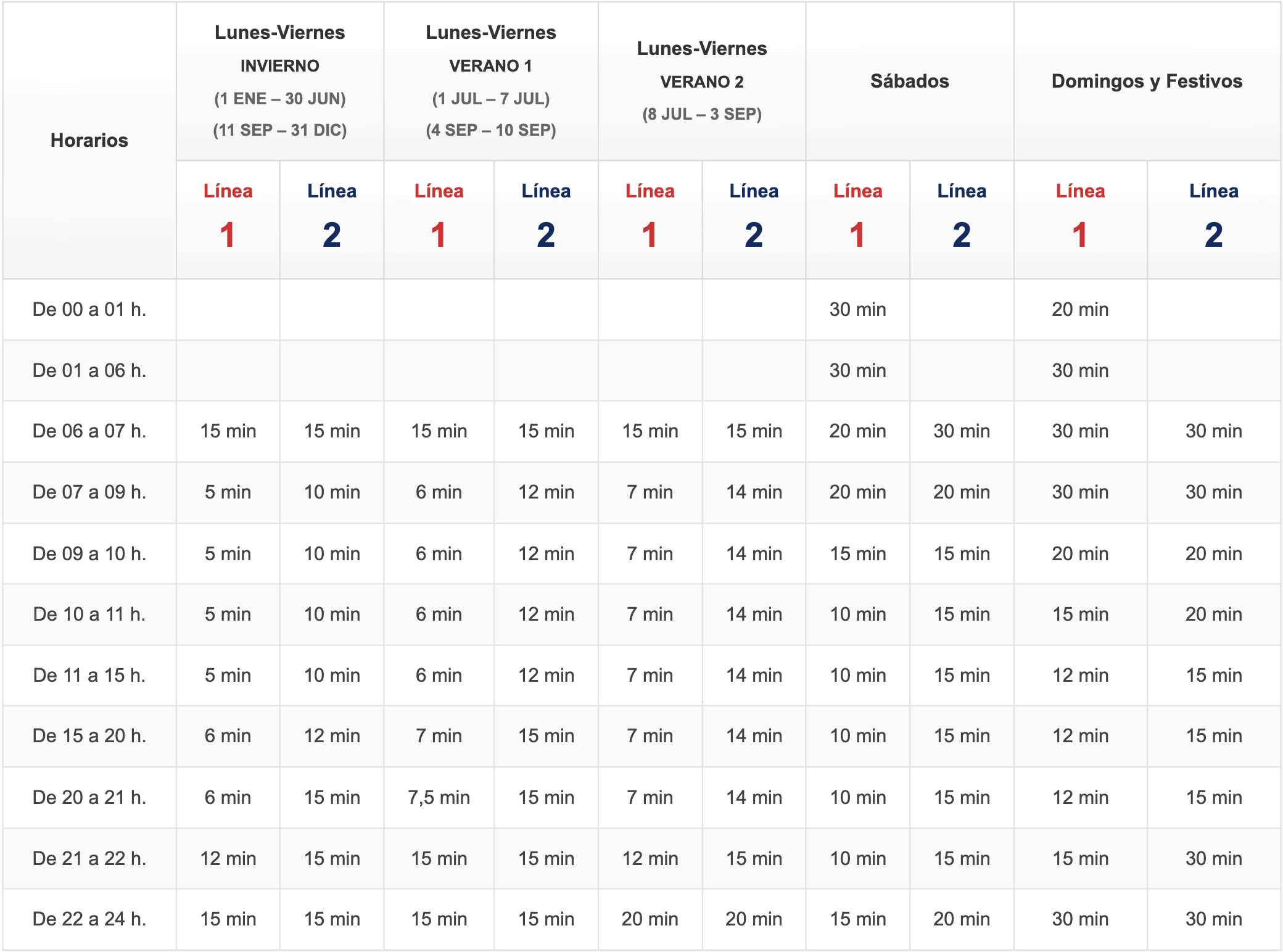 Servicio durante todo el año: de lunes a viernes de 6:00 a 24:00 horas; fines de semana y festivos con servicio ininterrumpido.